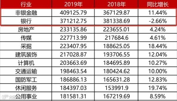 据wind统计,2019年银行平均薪资为37.12万元,非银金融(包括保险、证券等)更是以平均薪资40.9万元位列第一。