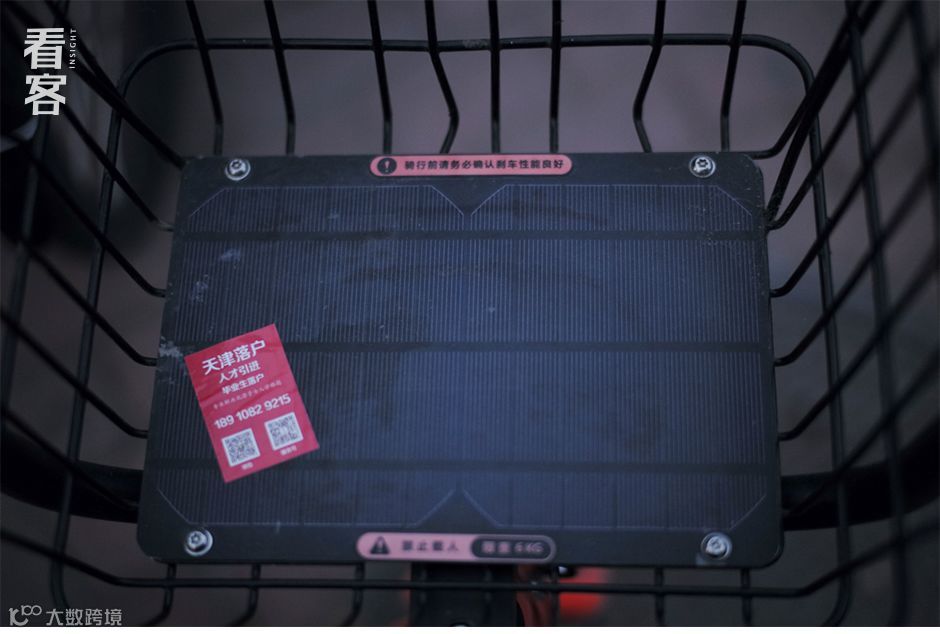 后厂村一架共享单车内,贴着“落户天津”的小广告