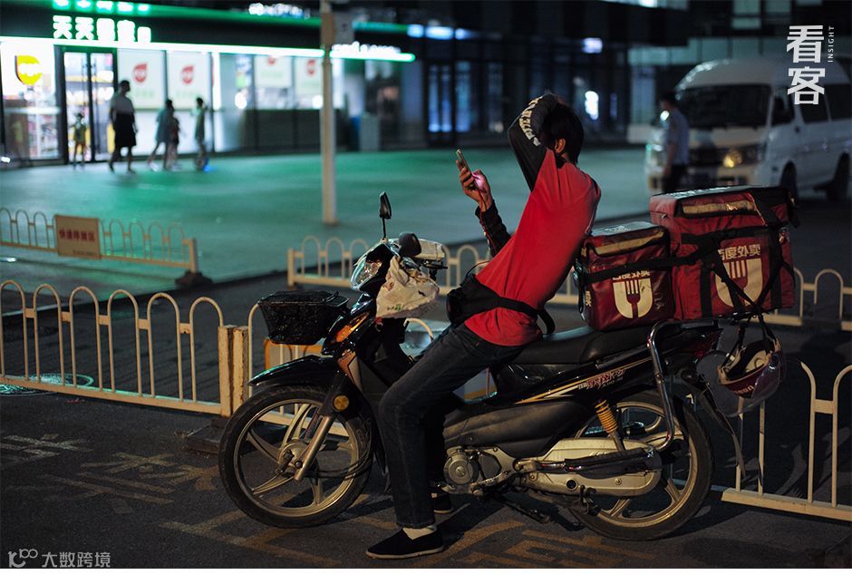 晚上九点半,滴滴公司楼下的便利店外,一位百度外卖小哥一边等活,一边刷抖音