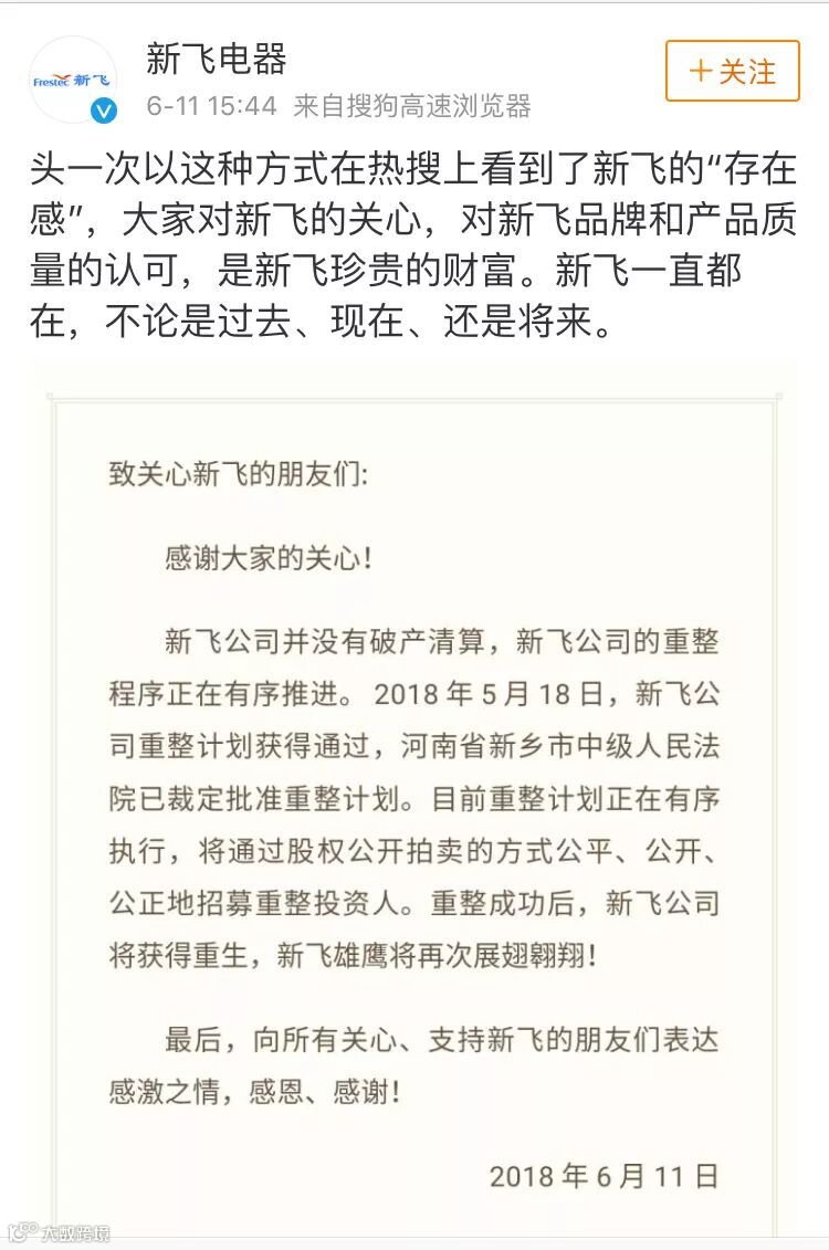 昨天下午,新飞电器就此前环球网报道的“新飞电器正式申请破产拍卖”一事发微博澄清道:新飞公司并没有破产清算,新飞公司的重整程序正在有序推进。