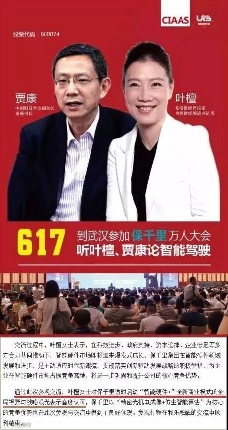 在活动中,复旦大学历史系毕业的叶檀老师,表示“对保千里的适时地启动智能硬件+全新商业模式的全局视野与战略眼光表示高度认可。”这句有点儿绕口的话,其实很有艺术,既能理解成“认可保千里”,又可以理解成“看好智能硬件”,模棱两可,相当有水平。