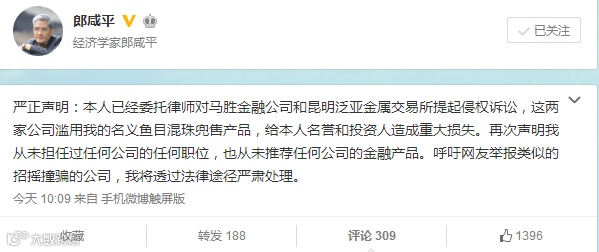 吃了泛亚的闷亏,郎教授迅速做出反应:起诉泛亚,撇清关系,并声明:“从未推荐任何公司的金融产品。”在此后的快鹿、望州等事件中,郎咸平也采用类似的方法来应对,不愧为经验丰富的老司机。