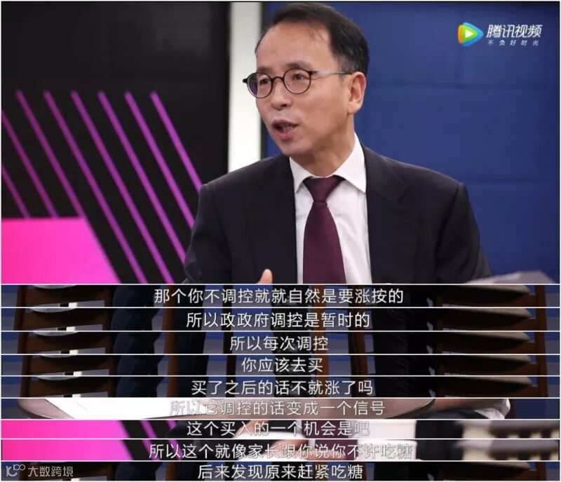 原话是:“那个你不调控就就自然是要涨的,所以政政府调控是暂时的,所以每次调控,你应该去买,买了之后的话不就涨了吗?所以它调控的话变成一个信号,这个买入的一个机会是吧,所以这个就像家长跟你说你不许吃糖,后来发现原来赶紧吃糖。”