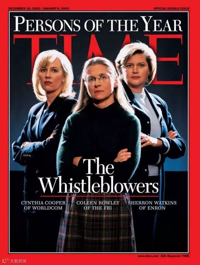 这三位女性分别是:捅出美国联邦调查局在“911事件”中失职的Coleen Rowley;揭露世通公司38.5亿美金造假的Cynthia Cooper;戳穿安然财务造假惊天内幕的Sherron Watkins,这几个揭发大型机构内幕、弊端和丑闻的女性,被《时代》杂志统称为“The Whistleblowers”(告密者)。