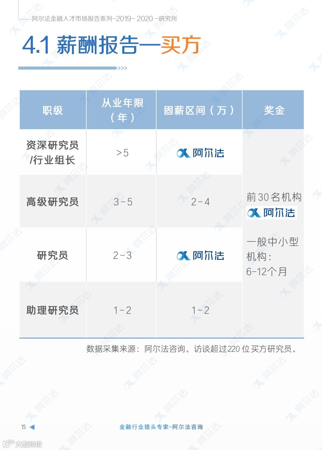 本报告数据收集截至 2019 年 12 月 15 日,数据及信息由阿尔法咨询一对一访谈、调研获得。调研人数超过 800 人次,涵盖主动管理排名前五十公募基金 28 家,中小型公募基金31家,证券公司资管和自营23家,并经由阿尔法特有的AI大数据系统分析得出 。