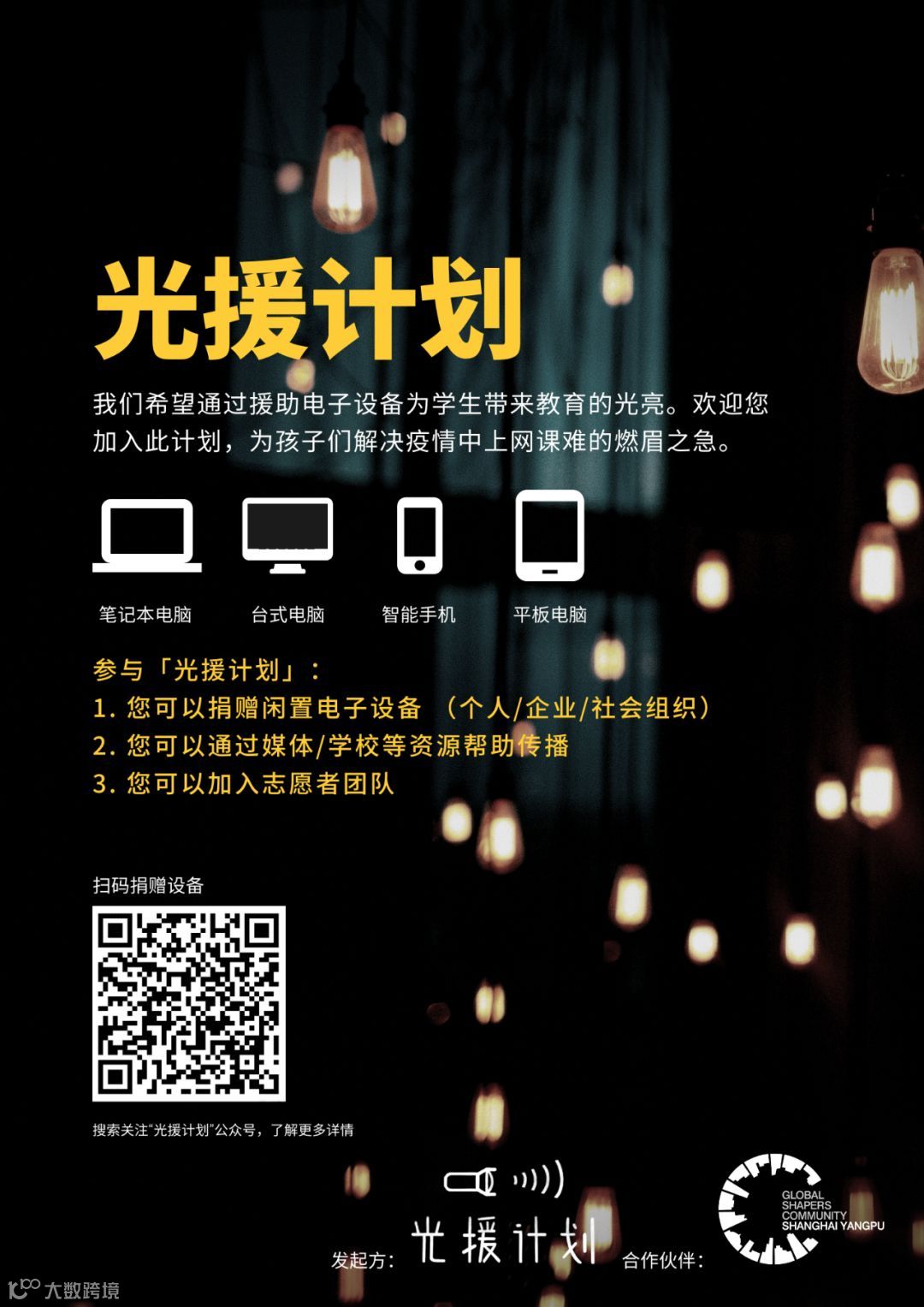 ,我们希望通过援助电子设备为学生带来教育的光亮。