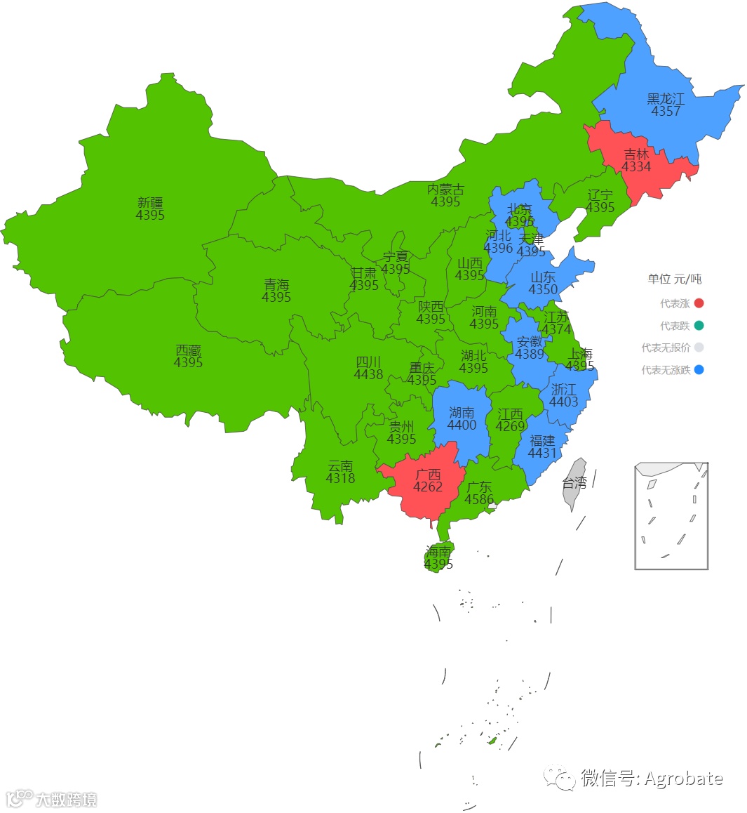 导读:按行政省采集不同样本点价格信息,计算玉米、豆粕大宗原料当日采购均价。 信息来自中国饲料行业信息网、Mysteel、百度爱采购等。供参考。