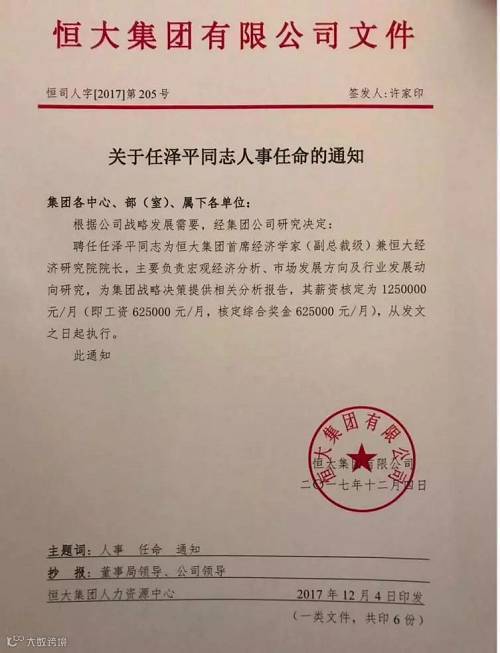 12月4日,几乎整个金融业界都在热议着一份红头文件。久负盛名的“教主”任泽平正式入职恒大集团,担任首席经济学家(副总裁级)兼恒大经济研究院院长。从国务院发展研究中心到国泰君安与方正证券,再至如今的恒大,任泽平的足迹已涉遍政、企、研三界。