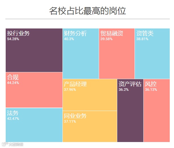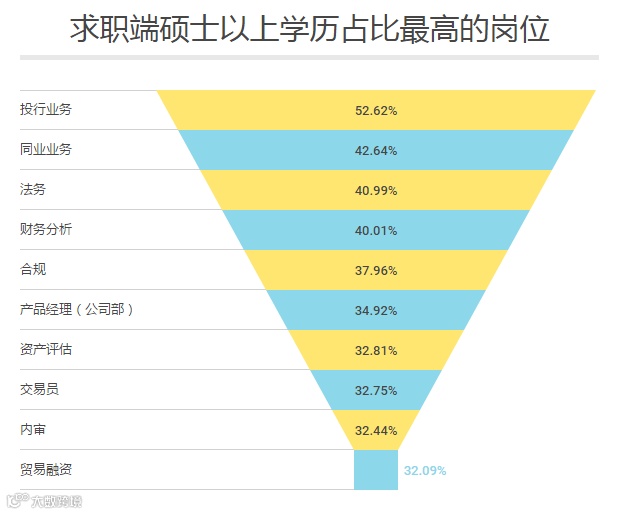 高薪岗位与高学历岗位的名单出奇一致,投行业务岗的学霸占比尤其亮眼,不仅一半以上(54.28%)出身自985、211名校,更有一半以上(52.62%)手拿硕士学位。法务、同业业务、合规的学霸比例同样巨大,无论硕士占比还是名校出身的占比,都超过35%。另外,名校排行及硕士以上学历排行,这两张表单挤进前10的岗位,占比无一例外都超过30%,即,要竞争这些岗位,至少要和1/3以上的高素质人才正面PK。银行界果然藏龙卧虎,想拿下高薪岗位的offer,没有几张亮眼的证照和名校背书不行。