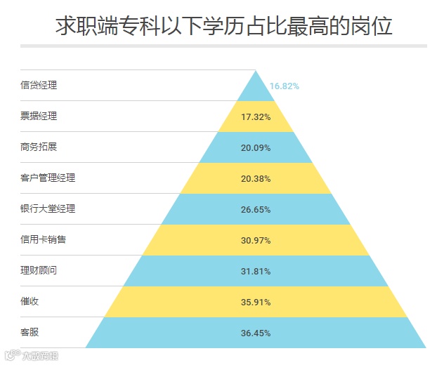 专科以下岗位则更多集中于销售类以及基层类岗位,客服、催收、客户管理经理、理财顾问、信贷经理,实际上都是与客户维系、销售息息相关的工作。这些岗位要在晋升方面也通常需要花更长的时间(见下图)。在跳槽市场上,这些岗位的人脉资源、业务熟悉程度以及突发状况的应变更有优势。