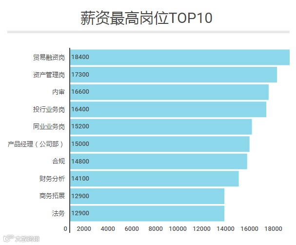 在薪资TOP10榜单中,贸易融资类、资产托管类、投行业务类、同业业务类岗位占据了前5的4席,平均工资从15K起,一路涨到18K以上。前5中唯一不涉及直接创造利润的是内审岗位。而从第6开始,岗位类型偏多元化,合规、财务分析、商务拓展、企划等各类型岗位纷纷榜上有名,且第10名的法务也突破了10K大关,可见银行各类业务板块的薪资水平都不低,竞争力十足。