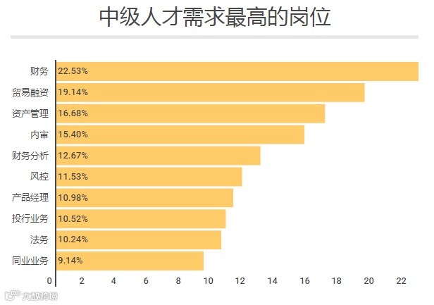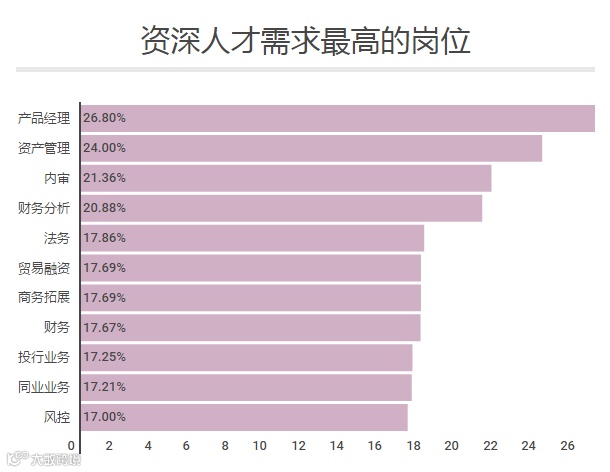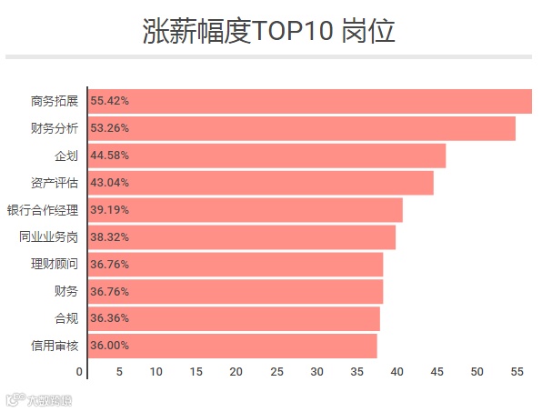 从榜单上看,2017年跳槽的薪资增长点中,最瞩目的是需要维护客户的岗位,包括商务拓展(55.42%)、银行合作经理(39.19%)、销售端的理财顾问职位(36.76%),都与客户关系的维护息息相关。此外,榜单还透露出财务专业人才的缺失,银行不缺会计,但缺乏对各类业务理解透彻的财务以及财务分析,因此今年这类人才的涨薪优势同样较为明显。