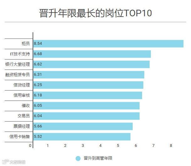 而银行大堂经理方面,尽管背着经理头衔,但从数据来看,目前诸多单位的银行大堂经理工作经验并不丰富,超过1/3以上工作经验在3年以下,晋升难度也位列前3甲。状况及境遇类似的还有柜员,两者的晋升难度都颇高,要一路晋升到高管,至少需要6-8年时间。实际上不仅大堂经理、柜员的晋升难度高,非核心业务岗位如IT技术支持、信用审核、催收等岗位的晋升难度及耗时同样高得可怕。