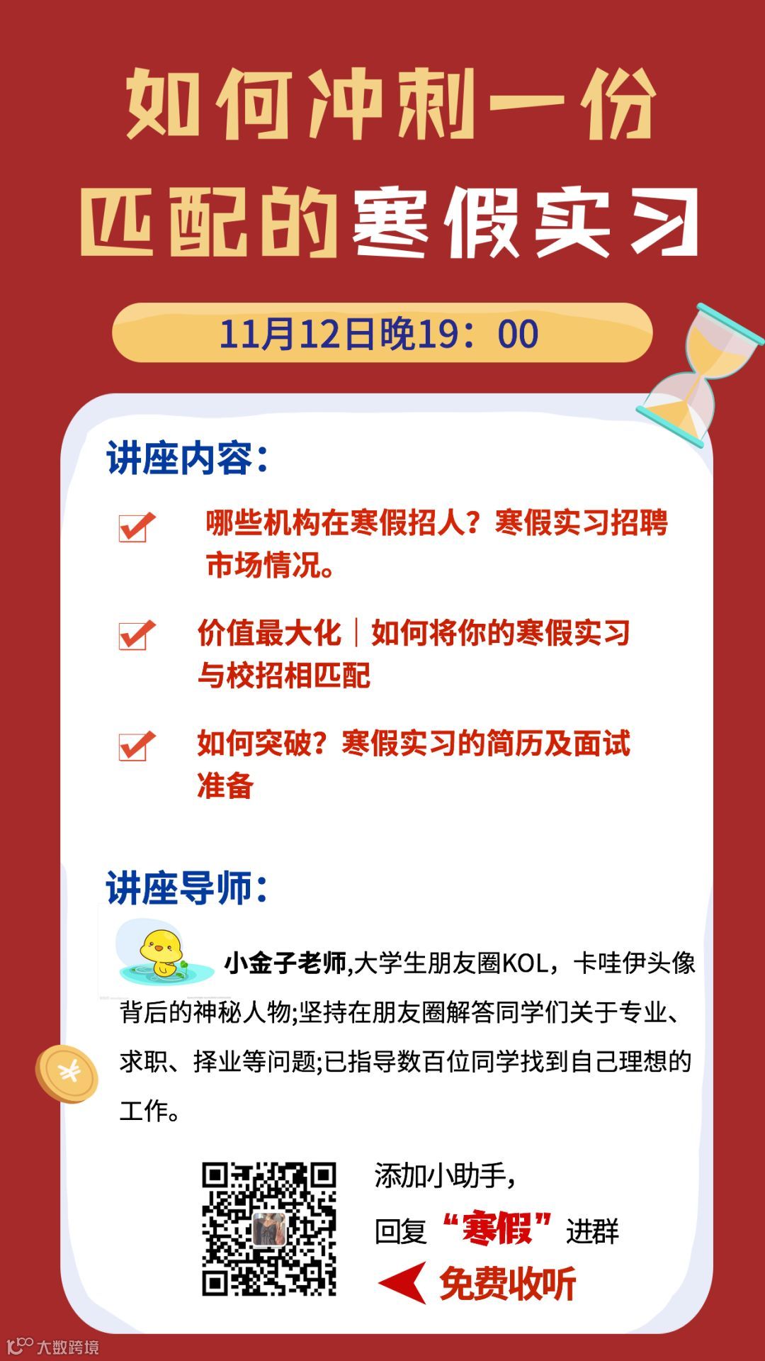 为了帮大家解决以上问题,金融小伙伴特此邀请小金子老师,11月12日晚7点,为大家专门讲一场关于《如何冲刺一份匹配的寒假实习》的讲座: