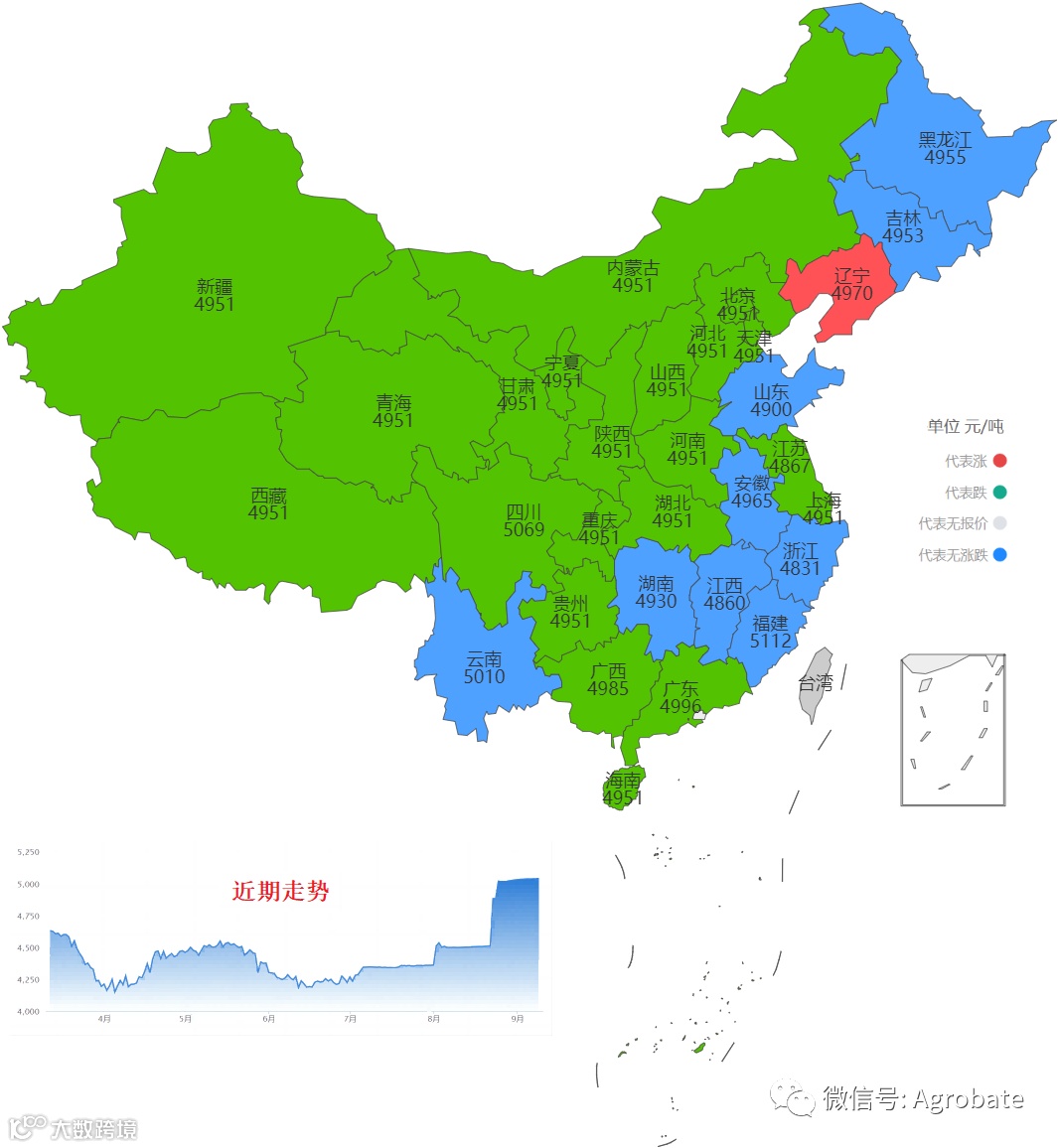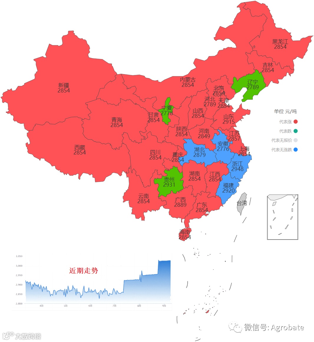 以行政省为区划,采集价格信息(来自中国饲料行业信息网、Mysteel、百度爱采购等),计算玉米、豆粕大宗原料当日采购均价。今日截至时间11:15。统计时间不同会造成当日价格有小幅差异。