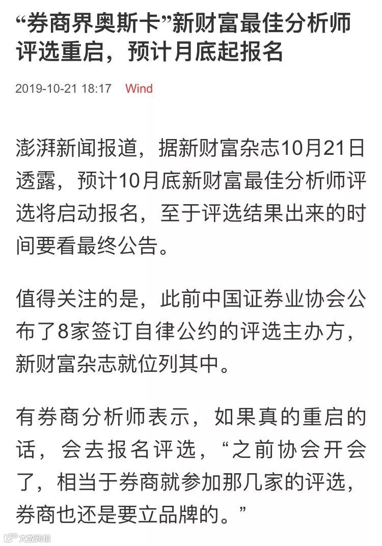 于本日,澎湃新闻记者从新财富杂志处获知,预计10月底新财富最佳分析师评选将启动报名,至于评选结果出来的时间要看最终公告。那么新财富的重启后,对行研工作机会有哪些影响呢?
