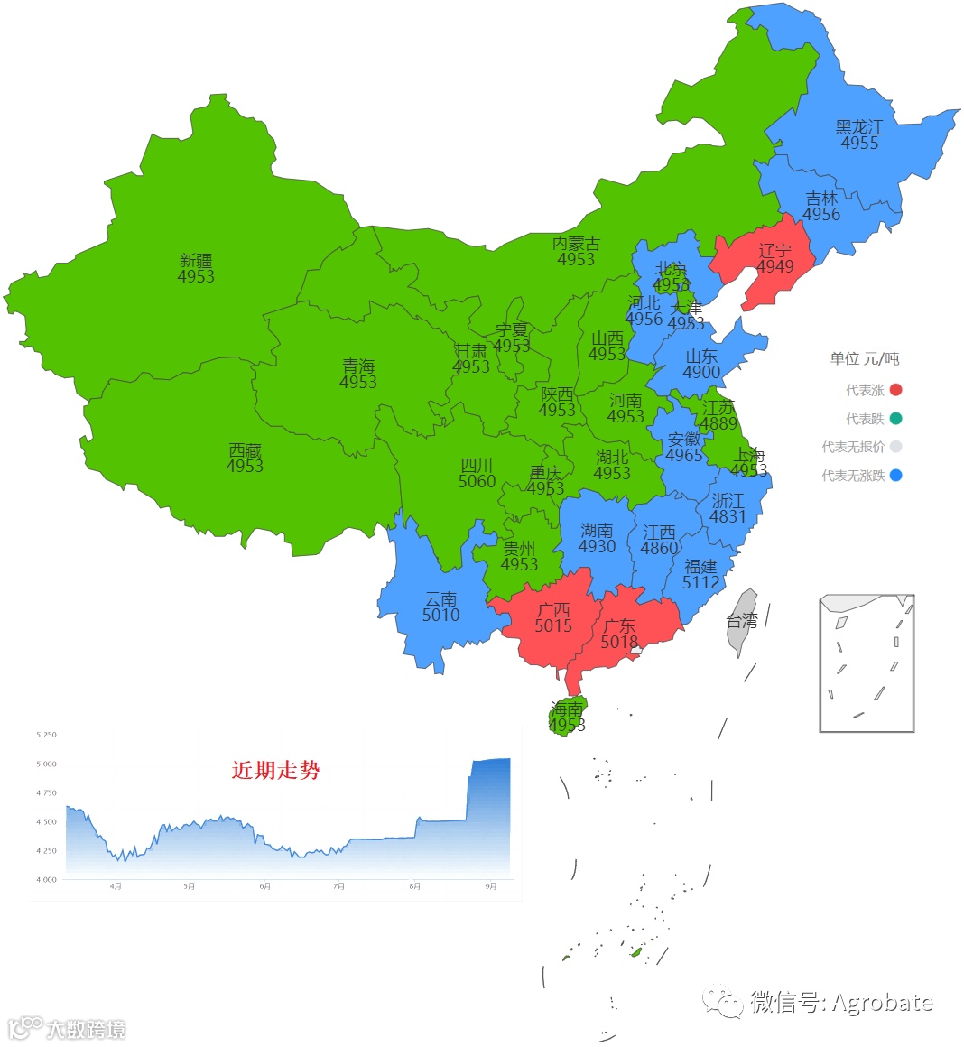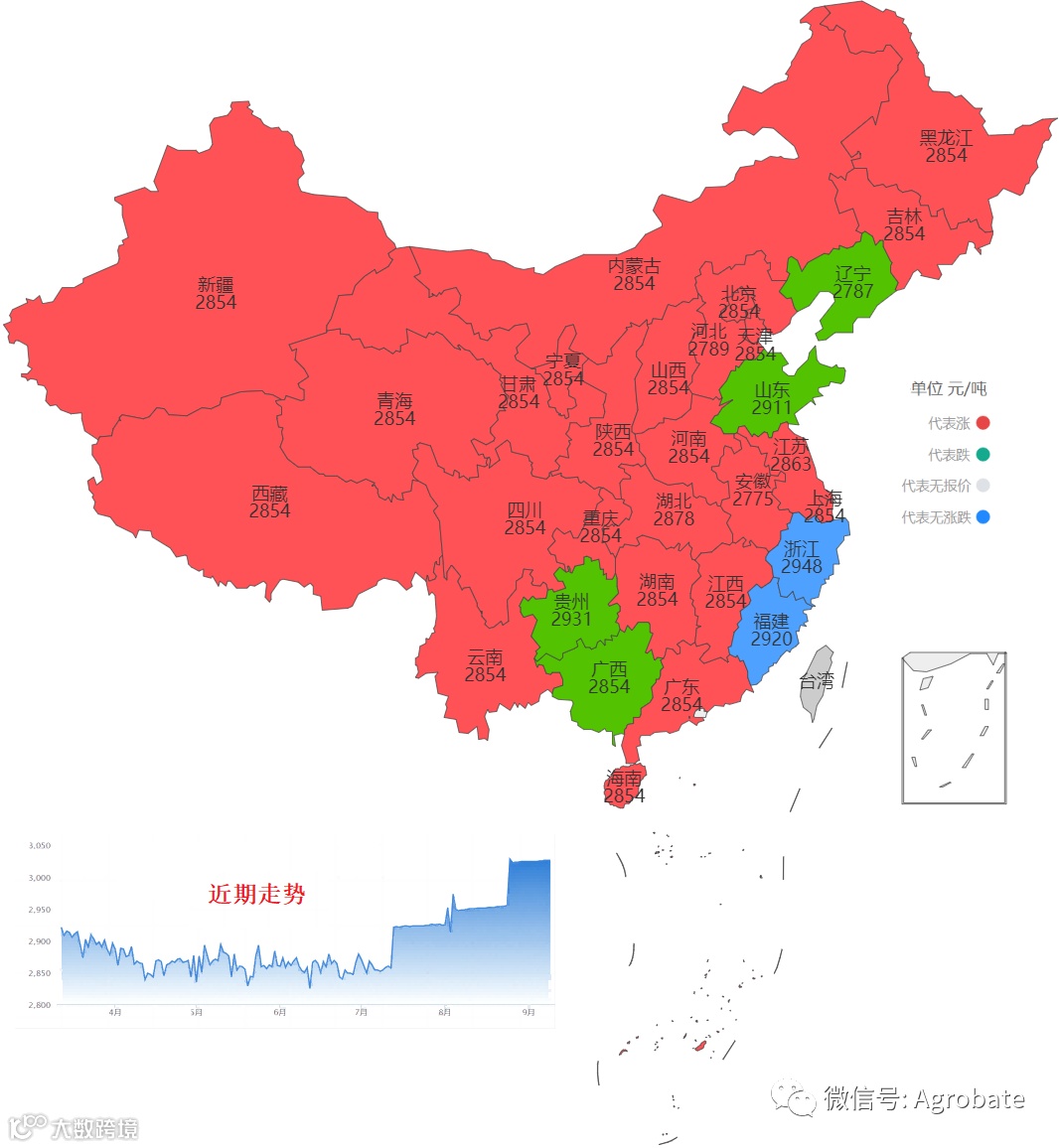 安佰特以行政省为区划,采集样本点价格信息(来自中国饲料行业信息网、Mysteel)、百度爱采购等),计算玉米、豆粕大宗原料每日采购均价。今日采集截止时间11:30,统计时间不同会造成当日价格有小幅差异。