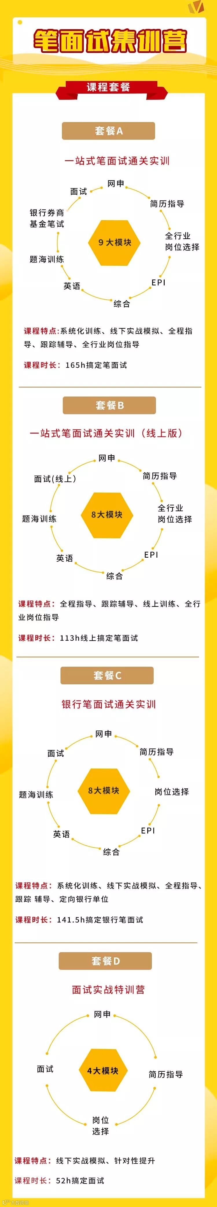 笔面试训练营通过分析银行、券商、基金的面试题总结出面试通关技巧,并进行实战模式,增强临场表现力。165H掌握银行/券商/基金等金融领域笔面试通关技能!节省备考时间,提高笔面试通过率,顺利收获满意的offer!