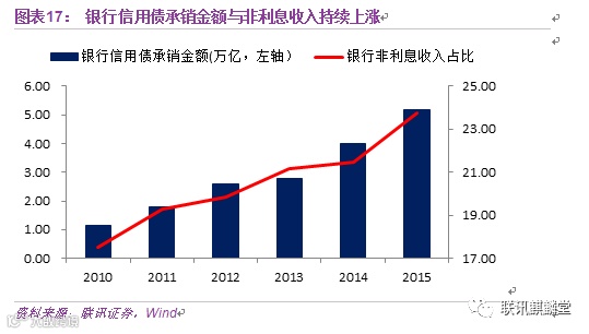 2014年以来的债牛不仅捧红了银行的二级债券投资,也给银行的一级债销业务带来了机会。2010-2015年,银行承销信用债的金额从1.15万亿上涨至5.16万亿。相对应地,银行的非利息收入占比也从17%上涨至23%。