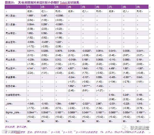 由于我国银行业之间的差异比较大,大型国有银行由于自身实力强,在经济形势下行的情况下,依然拥有着庞大优质的客户群体和盈利点。因为传统业务在银行效率贡献中的比重依然是占主导地位的,所以我们从第一张表中看到对于大型银行来说,金融市场业务的贡献度并不大,大型银行的金融投资业务(同业业务以及投资收益)并没有显著降低成本、提高收入效率以及利润效率(系数显著性不高)。社会融资结构情况对于大型银行作用不显著,但是符号为正,说明间接融资占比依然揭示了银行主导的金融结构,但是对于大型商业银行而言,社会融资结构目前的变化并没有显著影响到其效率,即“金融脱媒”现象对于大型银行影响尚不大。