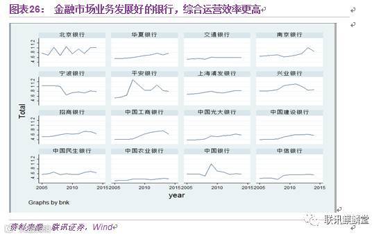 从图表26中,可以看到近年来大型银行的综合效率普遍较低,并处于一个下降水平。虽然其总量上占优,但从这种综合效率的测度来看,明显地,一些金融市场业务发展较快较好的银行,如南京银行、招商银行、兴业银行综合效率普遍较高。