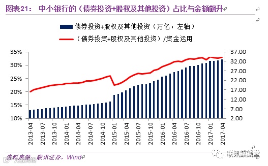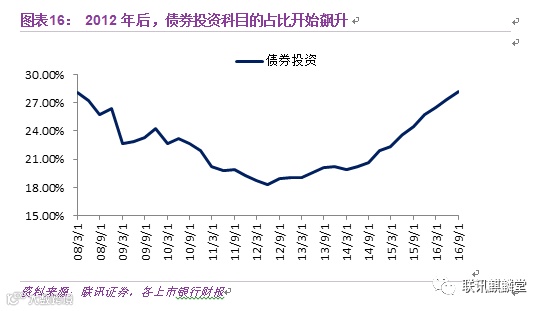 2014年初到2016年底,上市银行债券投资的占比(交易性金融资产+待出售+持有到期投资)从19%上涨至29%。