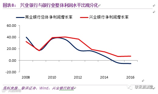但当2011年后风暴袭来,传统业务玩不转时,虽也受到影响,利润增速也处于下行的趋势中,但深耕于金融市场业务的兴业很好地利用同业、债券投资等业务利润予以对冲,与整体银行业利润增速的差距拉大到10%以上。