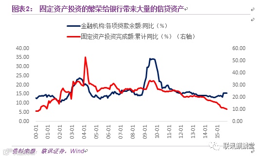 2001-2011年是中国经济高速发展的时期,也是固定投资的高峰期,年均增速达到24%。企业资本开支热情高涨,融资需求旺盛,相对应的给银行表内带来了广阔的信贷资产。