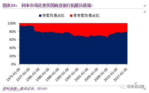 但在利率市场化进程结束后,美国商业银行没有在存贷业务上死磕,而是积极利用金融市场拓展负债端,同时玩转资产端,利用各类金融创新工具,摆脱单一同质化的存贷业务竞争。