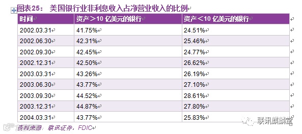 根据可得的数据,在金融危机前的2002-2004年间,无论是大银行还是中小银行,其非利息收入的水平占其营业收入的水平都在攀升,大银行的比例在40%以上,而中小银行则稳定在25-30%之间。