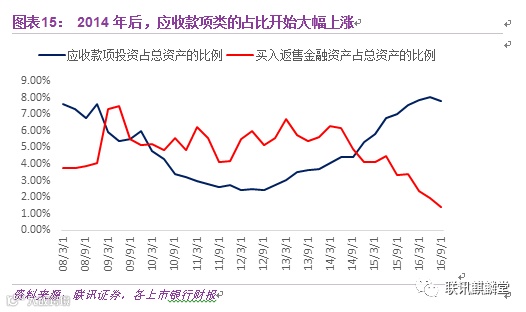 反映在银行的资产负债表中,是银行的债券投资科目与应收款项类科目的扩张,而在信贷收支表中,则是债券投资、股权及其他投资科目的快速增长。