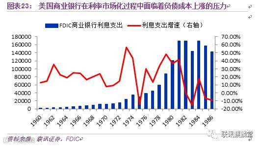 美国早在1974-1986年便完成了利率市场化改革。在利率市场化改革进程中,美国的商业银行也经历过负债成本上行,利息支出加大,存贷利差收窄的困境。