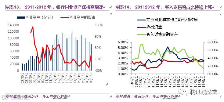 借助这样一个模式,上市银行同业资产尤其是买入返售项开始以超过30%的速度增长,从2009年的4.5万亿上涨至2014年一季度的12.09万亿,买入返售项占总资产的比例也从4.1%上涨至6.1%。