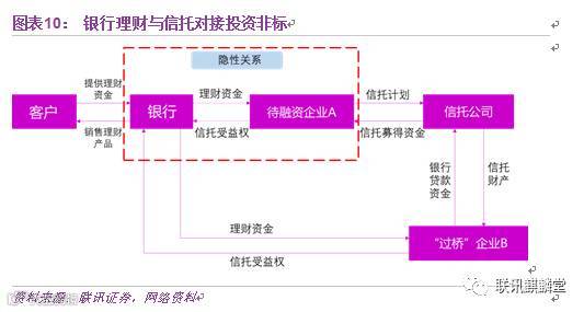 比如说以信托为例,假设银行C想要给企业融资。那么它可以先让一个银行A出资通过信托公司发一笔信托贷款,然后再引入一个过桥企业,让A银行将信托受益权转让给银行B,担当过桥银行。最后再由银行B再将信托受益权转让给银行C,由银行C真实出资。