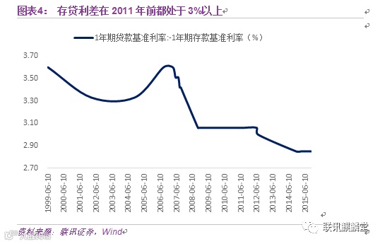 银行的负债端面临着愈加凶猛的虎狼,储蓄率从高位开始下滑,存款的增速在2010-2011年左右将近下滑了8个百分点,降至12-14%的增速。(图表3)