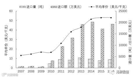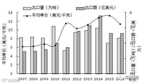 受国内消费刺激及技术性贸易壁垒影响,2015年后小龙虾出口量总体呈下降趋势。2016年小龙虾出口量较2014年降低0.64万吨,下降21.48%。从出口价格情况看,2007年以来小龙虾出口单价呈总体上升趋势,但2016年受国际虾价下跌影响,出口单价出现下滑。同时,小龙虾进口平均单价总体呈逐年上涨态势,2014年后趋于平稳。