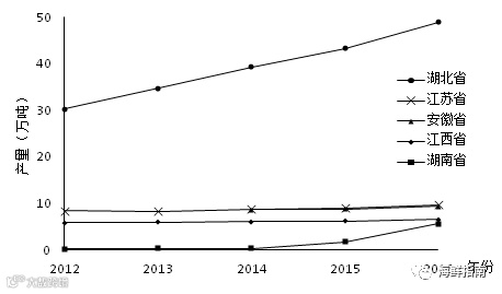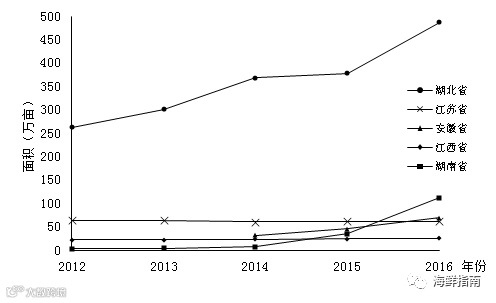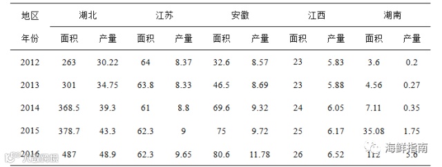 表1 2012-2016年五个主产省小龙虾养殖面积和产量情况 单位:万亩/万吨