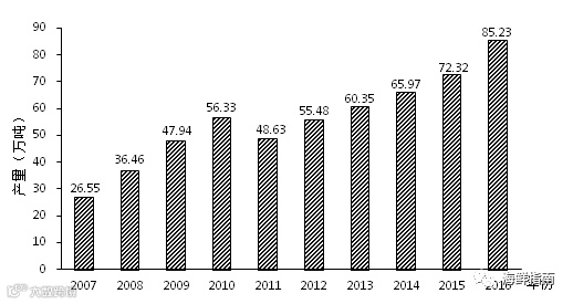 图1 2007-2016年全国小龙虾养殖产量变化情况
