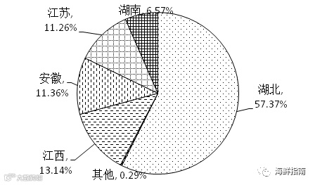 小龙虾主要产于长江中下游地区,湖北、安徽、江苏、湖南、江西等5个主产省产量占全国产量的95%左右。湖北省养殖规模最大,2016年养殖面积487万亩、产量48.9万吨,占全国近6成。近两年,湖南省养殖规模增长较快,四川、重庆、河南、山东、浙江、广西等省(区、市)小龙虾养殖也逐步发展,养殖区域逐年扩大。另外,部分省份尚有捕捞产量。
