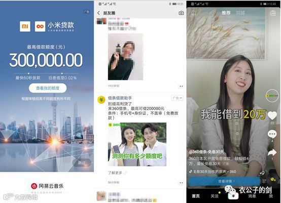 上周,衣公子的网易云音乐开机广告是小米小贷,微信朋友圈、抖音短视频也都刷到了360金融的广告。