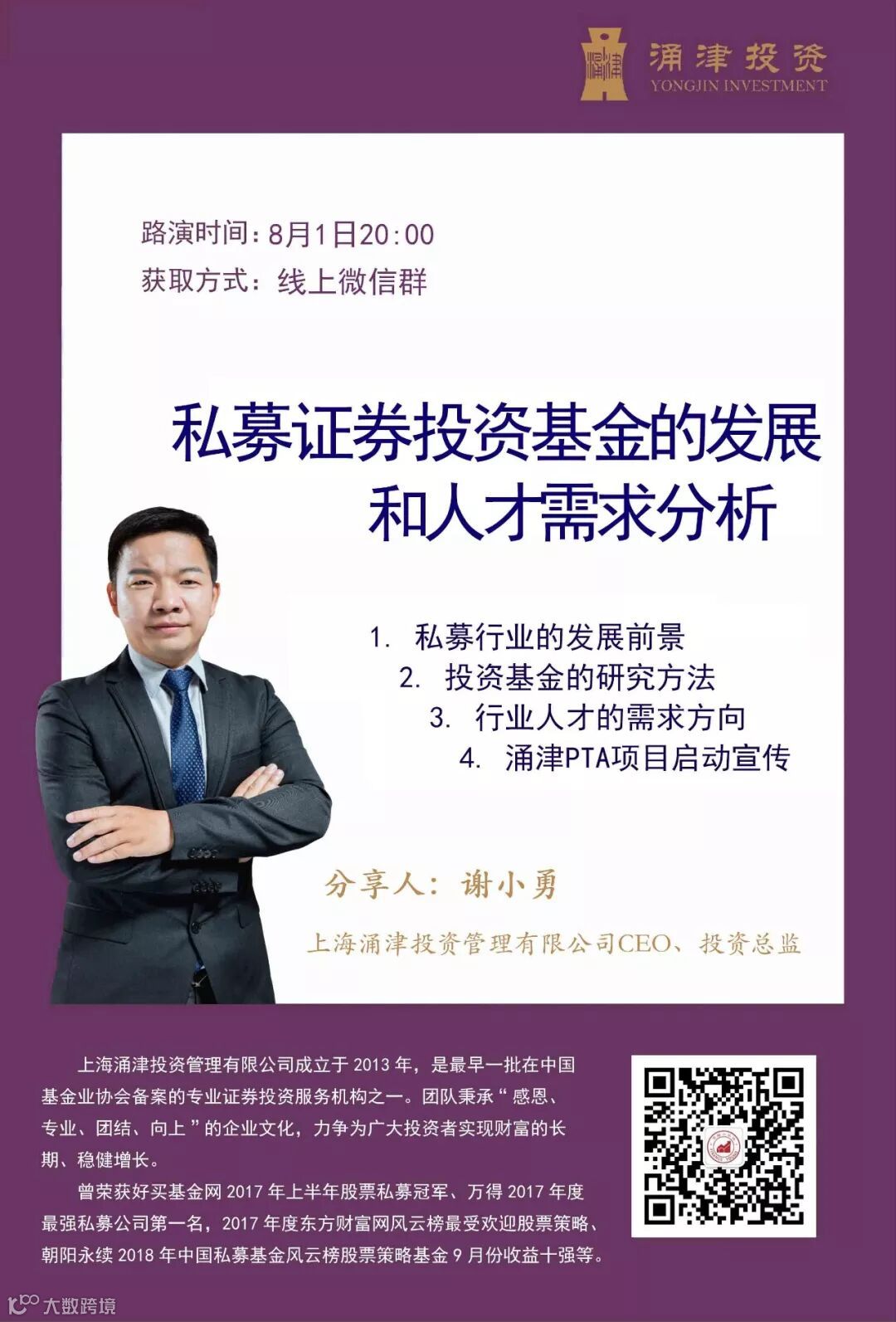 本次宣讲会将在【2019 上海涌津投资 人才培养计划】举行,扫码添加工作人员微信号,发送“涌津投资”即可入群。