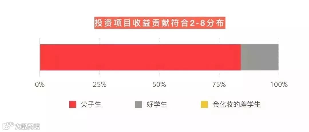 我们通过上图发现VC投资这个领域,回报也满足2-8定律;也就是说20%的优秀项目为基金贡献了超过80%的收益回报;所以,最终决定基金回报的就是那几个跑出来的头部项目。我们称作:少数项目决定最终回报。