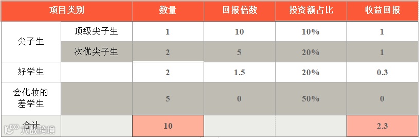 按照上面17%的年化投资回报,考虑到最好的年份VC退出率30%;假设你投资了10个项目,那么项目的分布大概是下面这样: