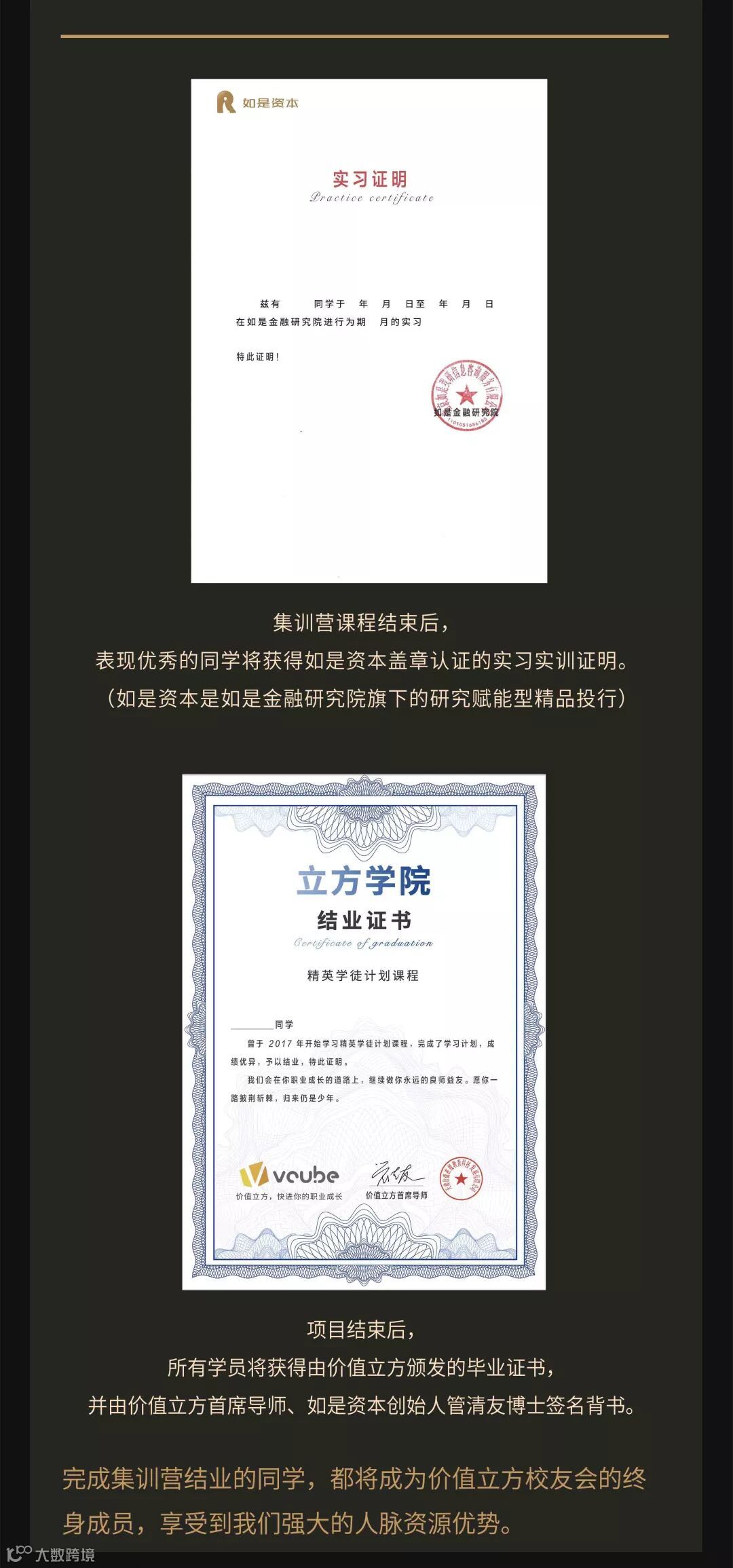 公司旗下付费升级品牌“价值立方”于2018年成立,旨在通过线上视频教育与线下集训营教学的双模式,为学员提供超高质量的职前教育服务。目前,价值立方拥有一批国内金融求职教育经验最丰富的在职导师团队,他们来自中信证券、申万证券、华夏银行、华兴资本以及上市公司投资部门等核心机构,各有擅长的领域,平均拥有上百小时授课经验,价值立方首席导师是如是金融研究院院长、民生证券原副总裁、民生证券研究院院长管清友博士。