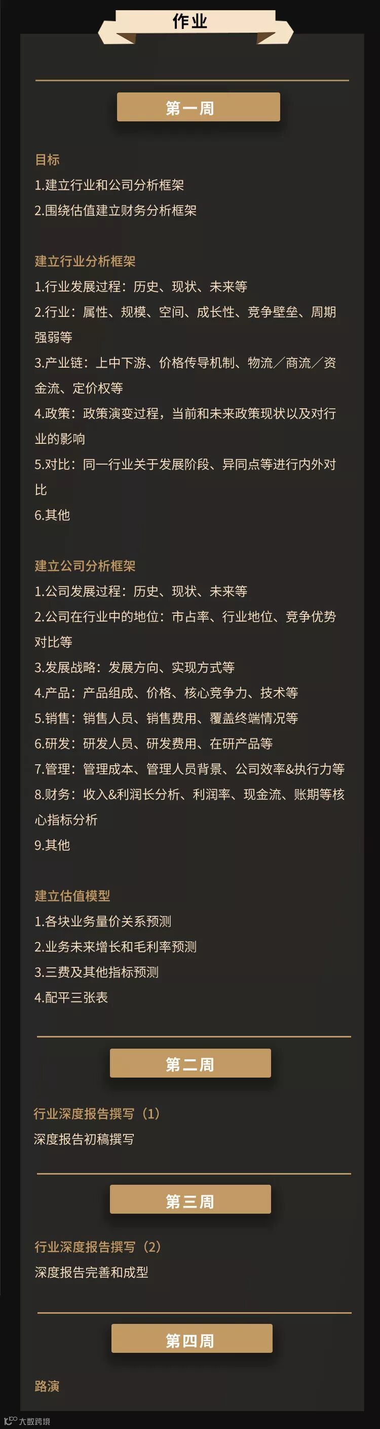 集训营的课程共32课时,统一安排在周末。每周课程结束后会由助教统一布置实战作业,学员在工作日内,以小组为单位完成。导师将根据学员的作业进度,进行每周2-3次的作业点评,深化投行技能的输出。点评通常安排在晚上进行,具体时间以上课通知为准。