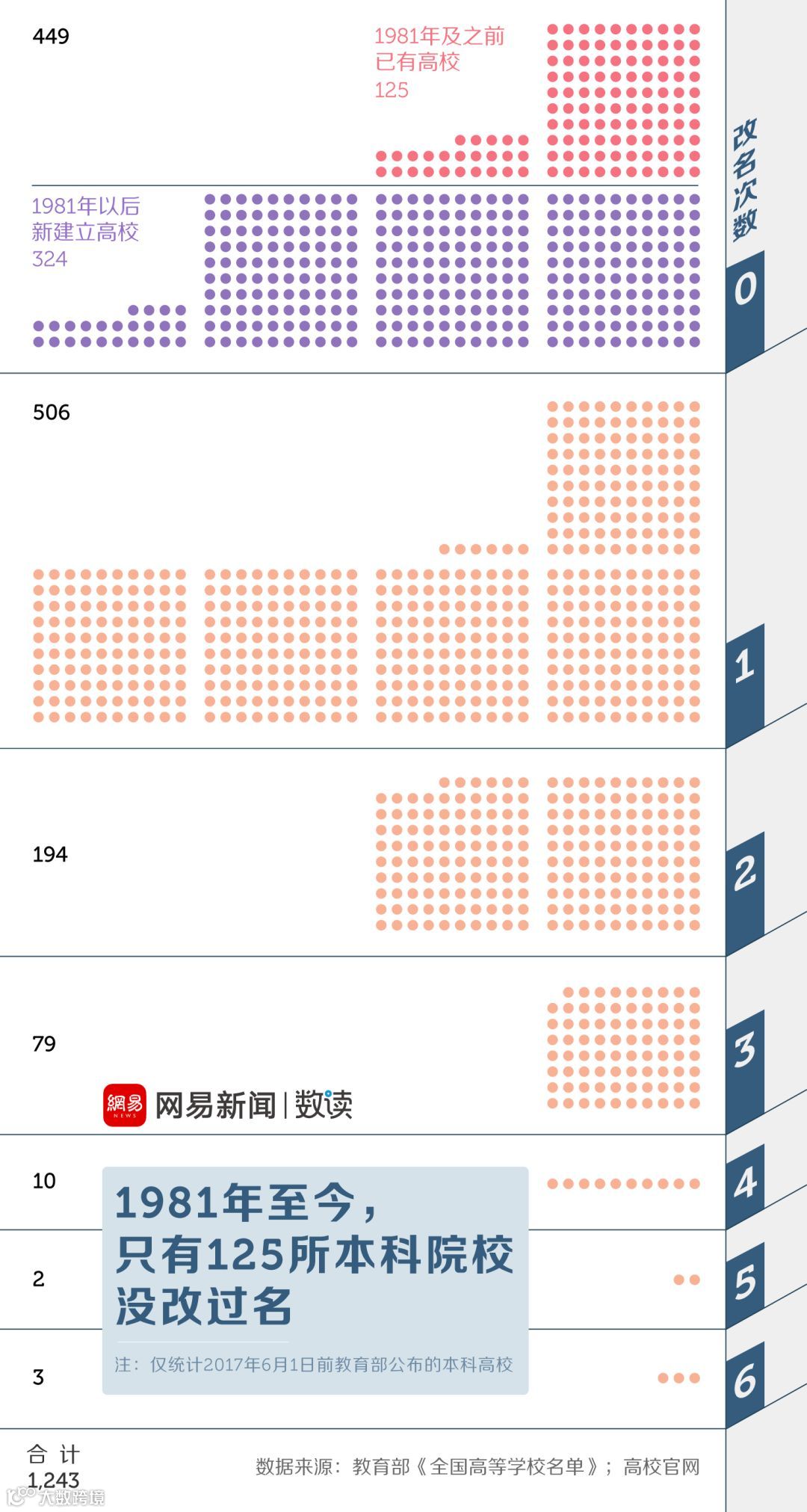 根据教育部公布的名单,截止至2017年5月底,中国共有1243所本科院校(不含港澳台)。其中,794所高校在1981年后至少改过一次名字,改了两次、三次名的学校也不在少数,而剩下的学校里,还有324所是在1981年后才成立的。