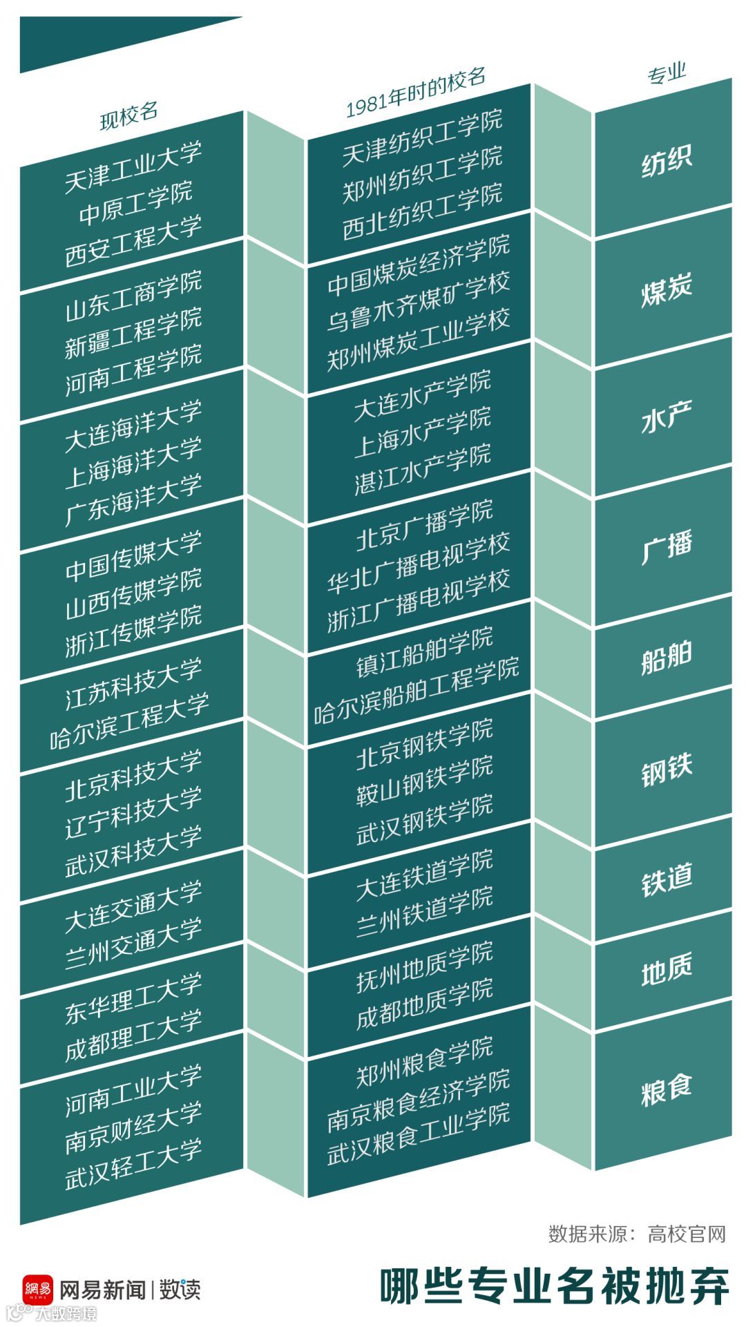 而那些原属于纺织工业部、煤炭工业部、粮食部的高校,也纷纷随着部委自身的撤并消失,改头换面,力求不落伍于时代。