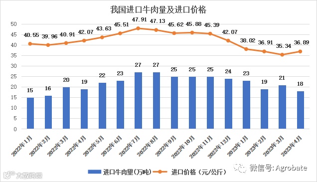 从2022年第三季度开始,我国进口牛肉总吨量和进口均价(根据进口金额和进口量折算)呈现振荡性下跌趋势。2022年7月我国进口牛肉总量27万吨、进口均价47.91元/公斤,2023年4月我国进口牛肉总量18万吨、进口均价36.89元/公斤,对比2022年7月进口总量下降约33%、均价下降约23%,降幅明显。
