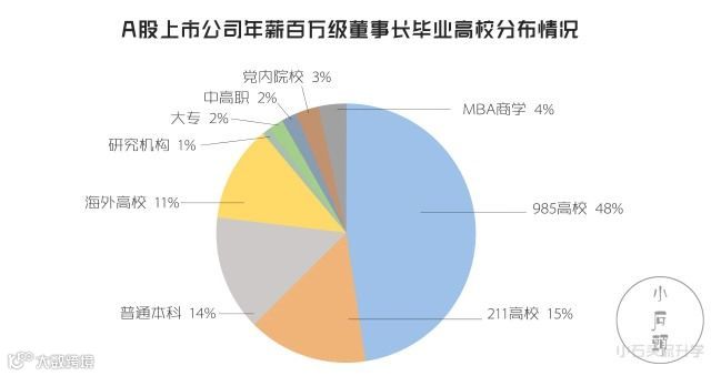 一份500名上市公司高管的教育程度调查中,84%的高管拥有高学历,48%出身于985名校。数据以同花顺、万得等软件所提供的年薪百万以上的A股上市公司董事长为基准。