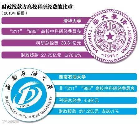 截至2014年7月,占本科数量14.3%的“211”“985”高校拿走了全国七成政府科研经费。其中,2009年至2013年间,“985”拿走1394.94亿元,占总经费52.7%;“211”拿走510.66亿元,占总经费的19.3%,其他2000多所学校分剩余不到30%的科研经费。